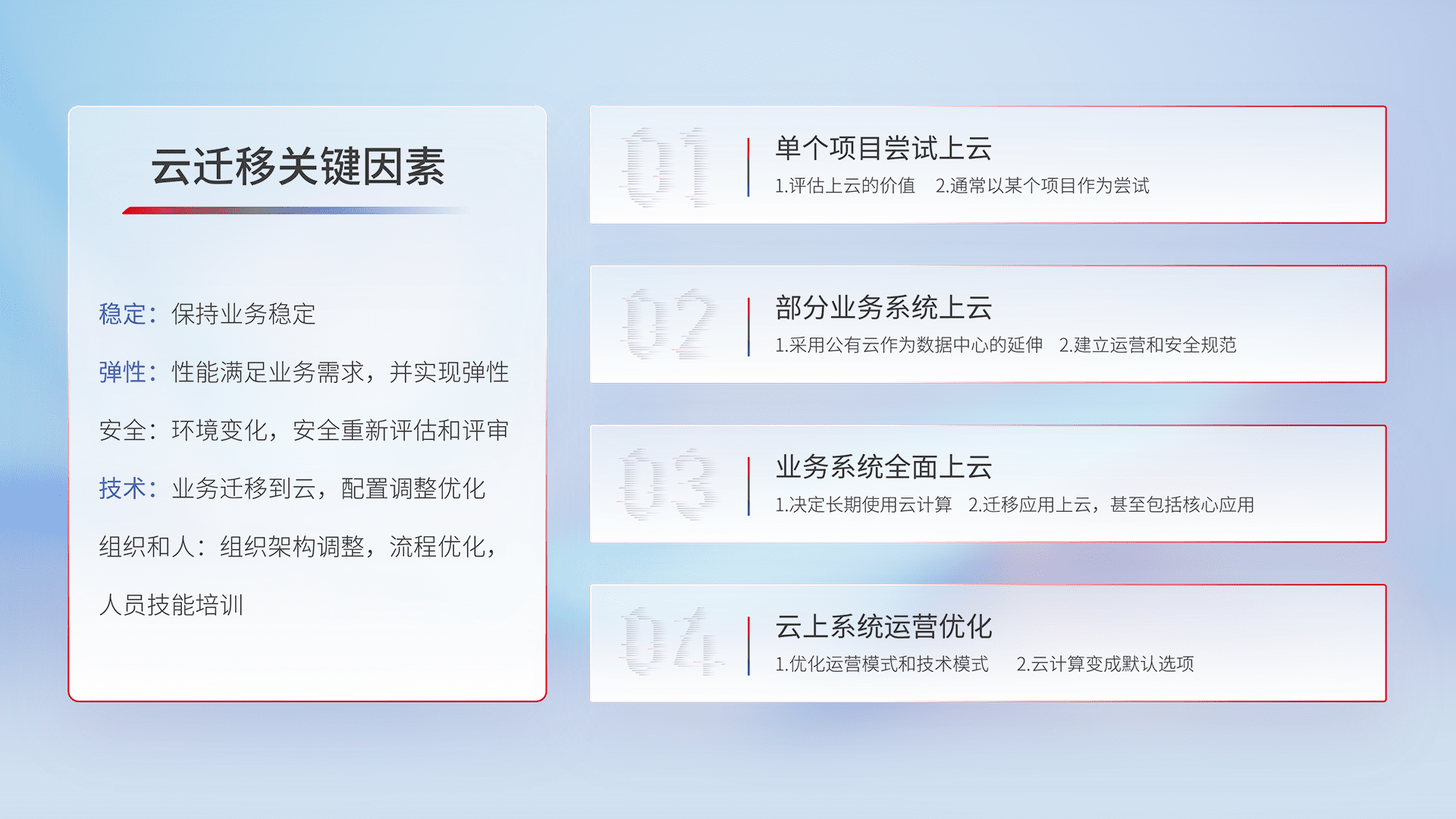 结合实际业务,,从规划设计、、云平台选型、、、云原生改造、、数据迁移、、集成交付,,,迁移全过程为客户识别最佳上云路径,,做好风险识别管理,,,设计网络架构、、身份权限、、、安全审计合规、、操作审计、、、、日志审计、、、监控告警策略、、多站点容灾设计等,,对云上基础设施进行整体规划,,,提升IT治理水平,,,以满足弹性、、、、高可用、、高性能的需求。。。。