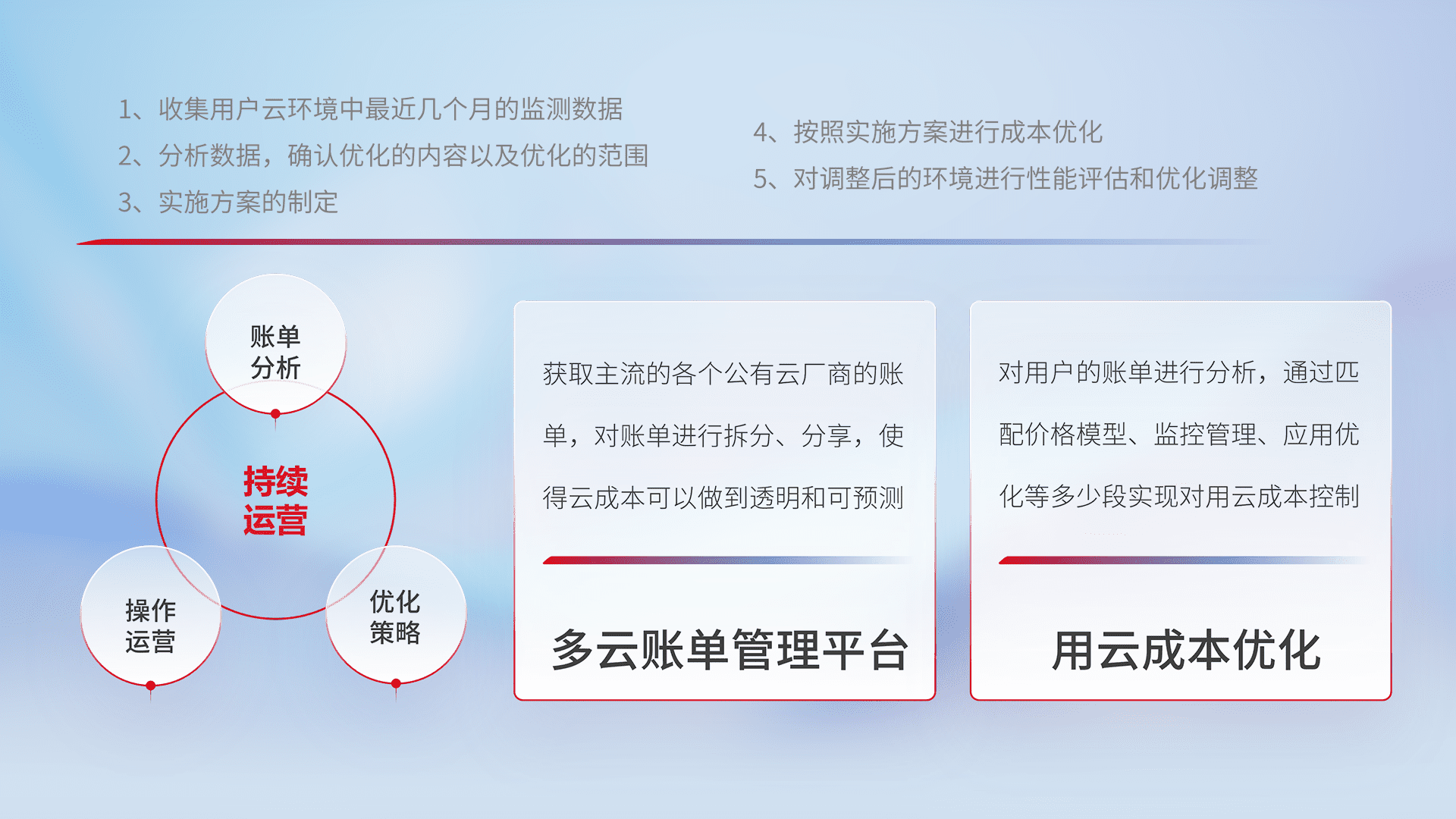 通过多云纳管,,,以统一的资源数据模型把客户的云资源进行抽象和封装,,,进而实现对多云资源的统一操作,,,保障云资源管理的可靠性、、、稳定性与可用性。。。量身定制化运维内容,,配置、、、、开发运维、、补丁管理、、备份、、、、监控、、、、认证和访问管理、、审计和日常巡检等,,,保障在用云过程中的可靠度,,稳定度以及高可用率。。