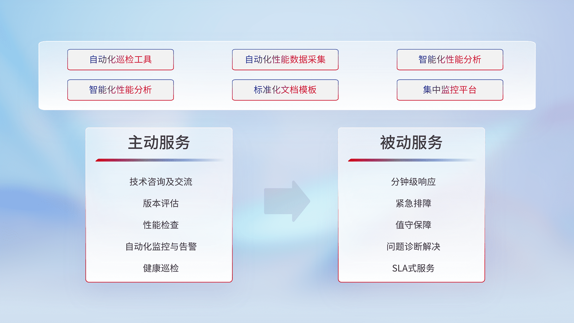 智能化工具和标准化文档,,,保障服务质量,,,,提供主动服务(包含技术咨询、、版本评估、、、性能检查、、自动化监控与告警、、、健康巡检)和被动服务包含(分钟级响应、、、紧急排障、、值守保障、、问题诊断解决、、、SLA服务)。。